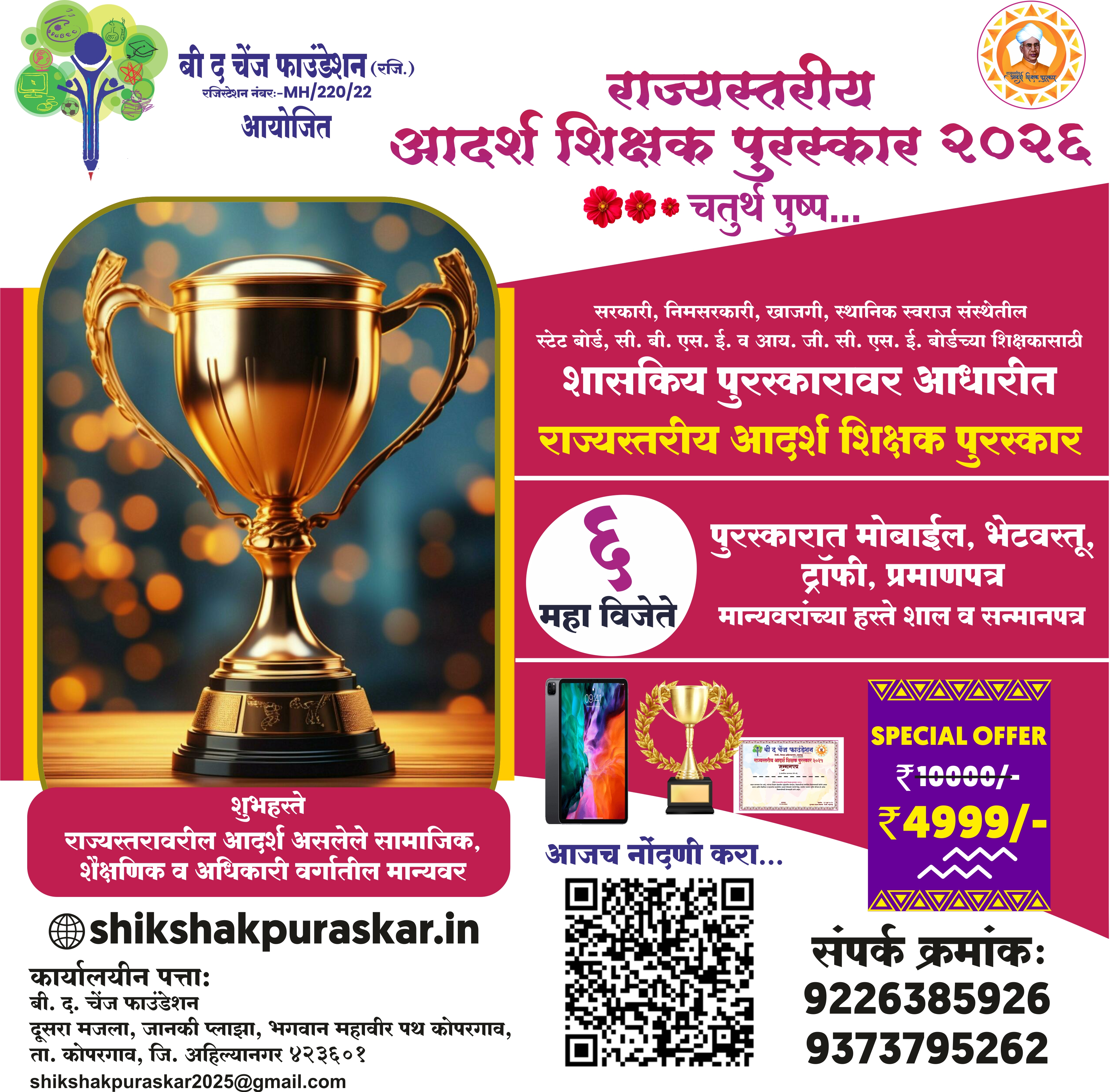 समर्पित वृत्तीने काम करणाऱ्या शिक्षकांना दरवर्षी शासनाच्या विविध विभागाद्वारे व स्वयंसेवी संस्थांद्वारे आदर्श शिक्षक पुरस्काराने गौरविले जाते. परंतु अनेक मेहनती, होतकरू व उपक्रमशील शिक्षक अशा पुरस्कारांपासून वंचित राहतात व त्यांचे कार्य समाजापर्यंत पोचत नाही. अशा शिक्षकांना ओळखून त्यांचा सन्मान करण्याच्या उदात्त हेतूने या “बी द चेंज फाउंडेशन द्वारा राज्य आदर्श शिक्षक पुरस्कार २०२६” चे आयोजन करण्यात येत आहे. त्यामुळे राज्य अथवा केंद्र शासनाचे आदर्श शिक्षक पुरस्कार प्राप्त शिक्षक तसेच जिल्हा परिषद, नगर पालिका महानगर पालिका पुरस्कार प्राप्त शिक्षक यांनी कृपया नामनिर्देशन प्रस्ताव दाखल करू नयेत. सदर शिक्षकांनी कृपया फोन व ईमेल द्वारे बी. द. चेंज फाउंडेशन ला संपर्क करून आपले बहुमूल्य मार्गदर्शन करावे.